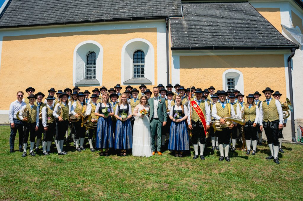 Am 5. Juli gaben sich unsere Saxophonistin Lisa Aichinger und ihr Mann Michael Hinterberger in der Wallfahrtskirche Hilkering das Ja-Wort. Nach dem festlichen Gottesdienst erwarteten wir die Beiden vor der Kirche und sorgten bei der anschließenden Agape mit einigen Märschen für die musikalische Unterhaltung. Ganz nach Tradition durfte Lisa selbst einen Marsch dirigieren, während Michael den Platz an der großen Trommel einnahm. Am Abend waren wir bei der Hochzeitsfeier in der Hofbühne in Tegernbach zu Gast. Natürlich waren wir auch beim „Brautstehlen“ mit dabei und feierten kräftig mit.